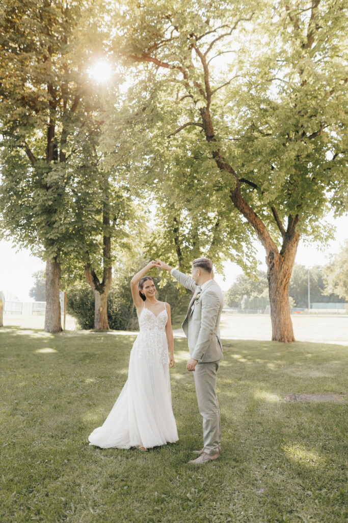 Ich glaube, jede/r Fotograf*in würde die gleiche Antwort haben: Eine Stunde vor Sonnenuntergang oder gleich früh morgens nach Sonnenaufgang. Neben guter Stimmung und Sympathie ist das Licht für unsere Fotos fast das Wichtigste. Natürlich können wir auch schöne Hochzeitsfotos am Nachmittag machen – wenn ihr aber so planen könnt, dass wir uns kurz vor Sonnenuntergang nochmal davonschleichen können für Hochzeitsbilder – macht das :).